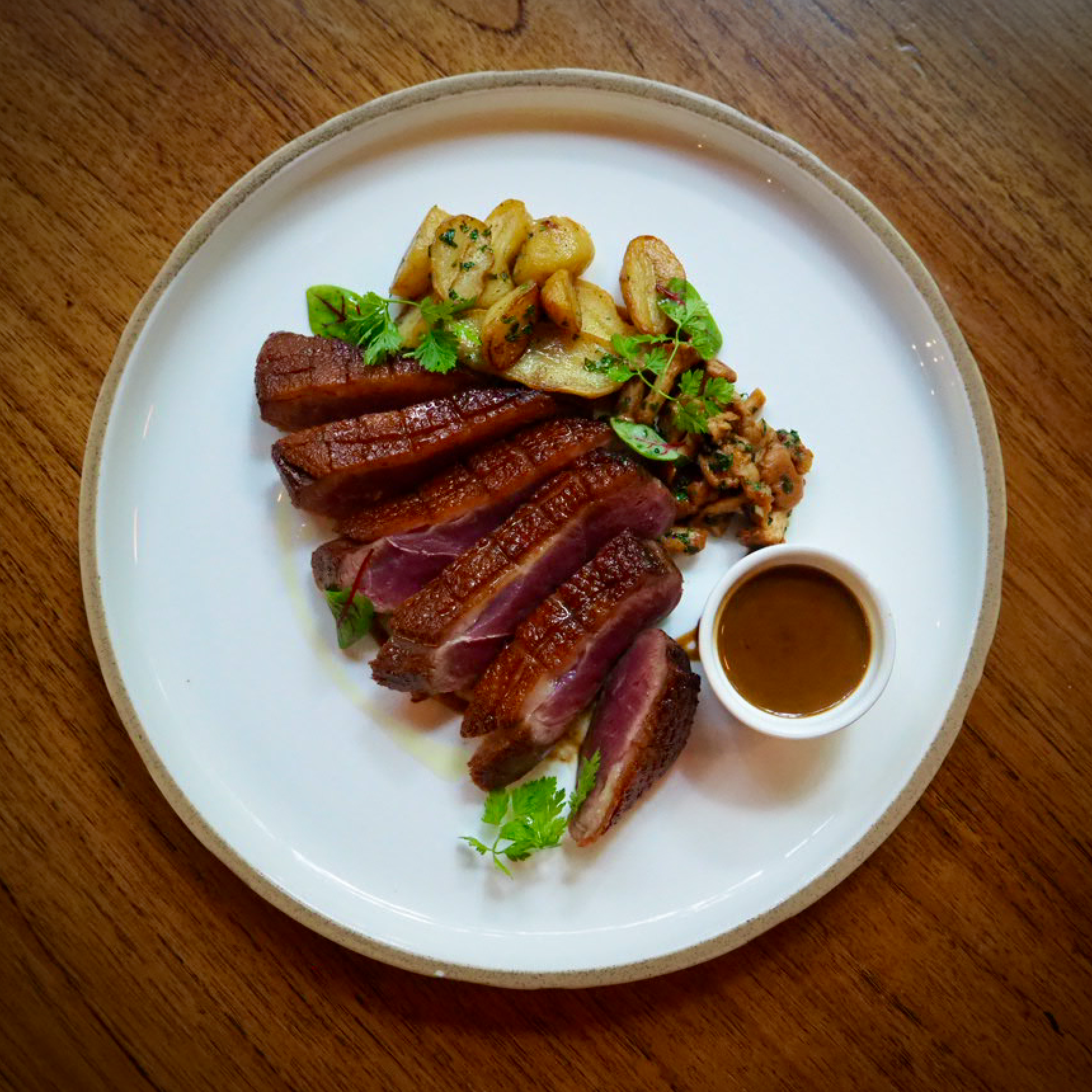 Imagine a plate with a luscious duck breast that has been expertly seared, its skin crisped to a golden perfection to reveal a juicy interior that sparkles with flavor. Each slice is a marvel of juicy, soft meat with a rich flavor that is both luxurious and delicate. To complement the richness of the duck, there is a mélange of Girolles mushrooms that have been sautéed to a fragrant, earthy perfection. Rattes potatoes, which have a buttery texture and a delicate nutty flavor, give the dish a cozy touch.
