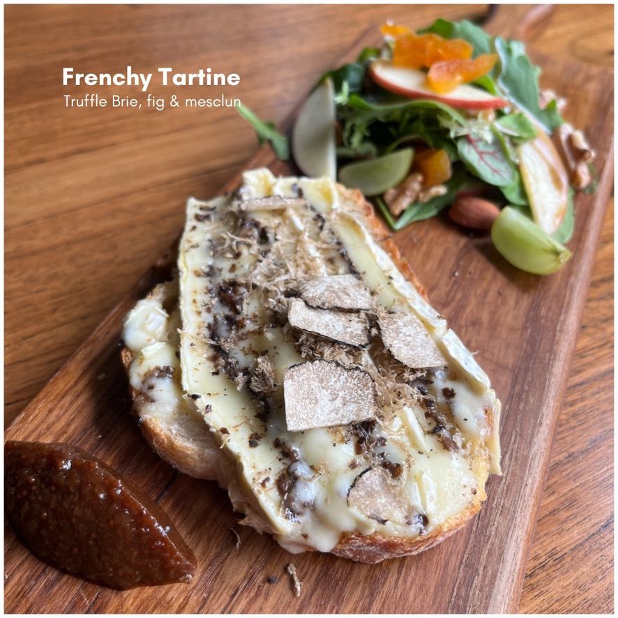 Our "Frenchie Tartine" is a gastronomic wonder. Consider this: creamy Truffle Brie mixed delicately with sweet, juicy figs, all over a bed of vivid mesclun greens. Each bite is a flavorful ballet in which the earthy richness of truffle meets the delicious sweetness of fig, all perfectly balanced by the freshness of mesclun.