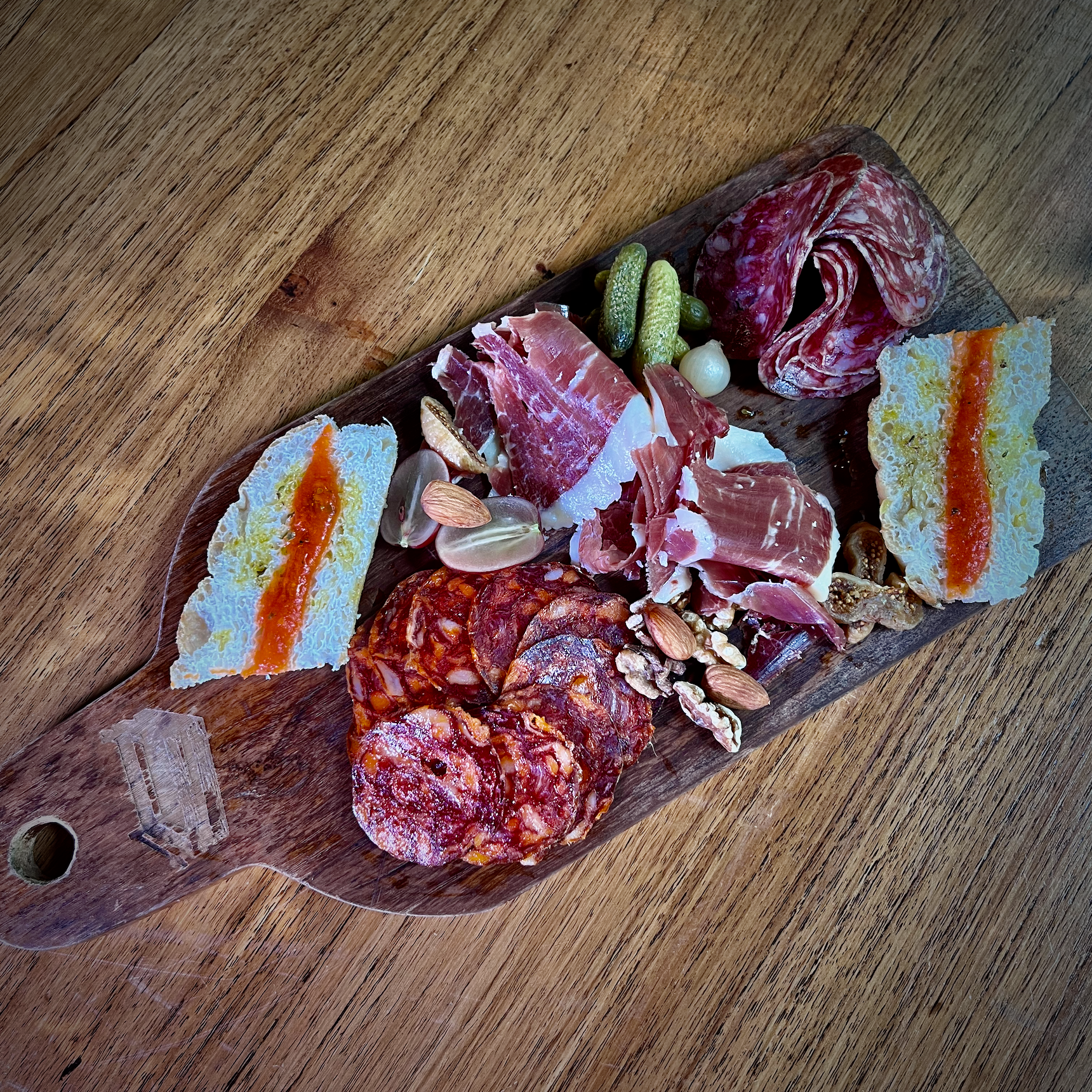 Introducing our exquisite Cold Cut Platter, a celebration of artisanal charcuterie at its finest. Delight in the bold, smoky notes of Chorizo, meticulously crafted to perfection. Savor the robust flavor of Salchichón, a testament to traditional Spanish curing techniques. And then, the Back Leg Ham aged for a remarkable 48 months, a true marvel of flavor and texture.