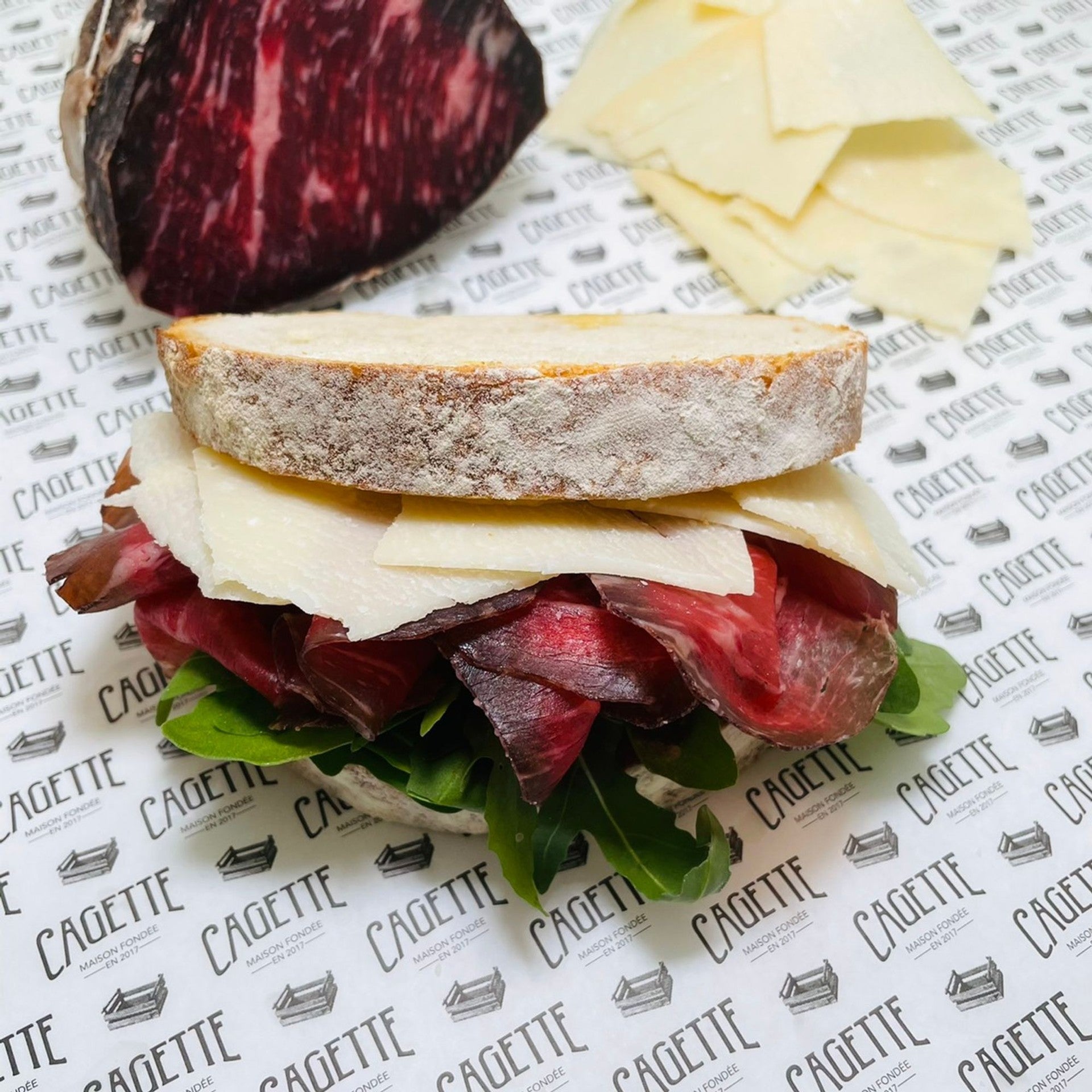 Home cured Beef ‘’Bresaola’’ with Parmigiano & Rocket in Sourdough bread