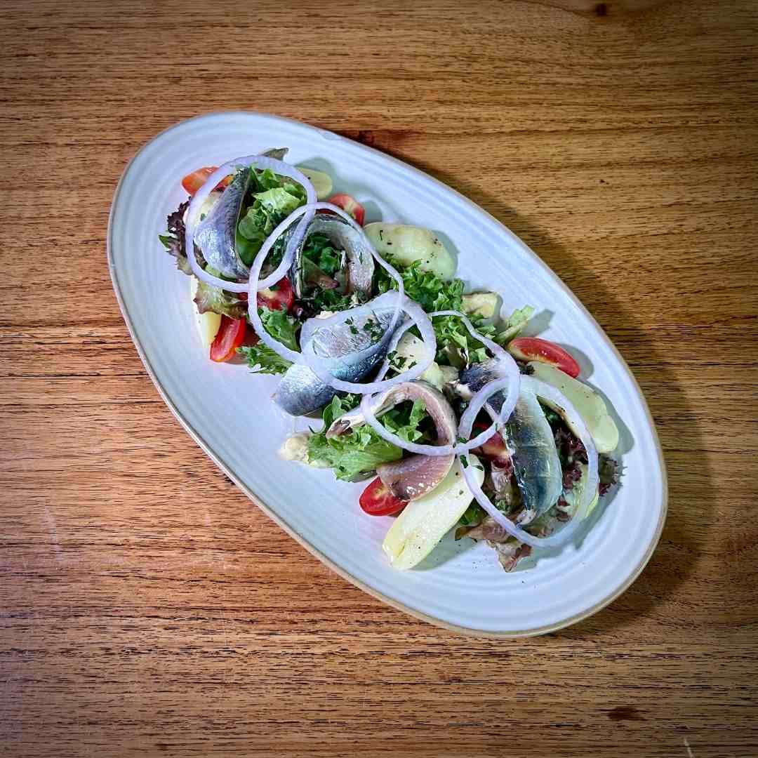 With our Marinated Sardines Salad, take a gourmet trip to the Mediterranean's sandy coastlines. The earthy deliciousness of soft potatoes, the zing of red onions, and the bold tastes of marinated sardines are beautifully combined in this colorful creation.