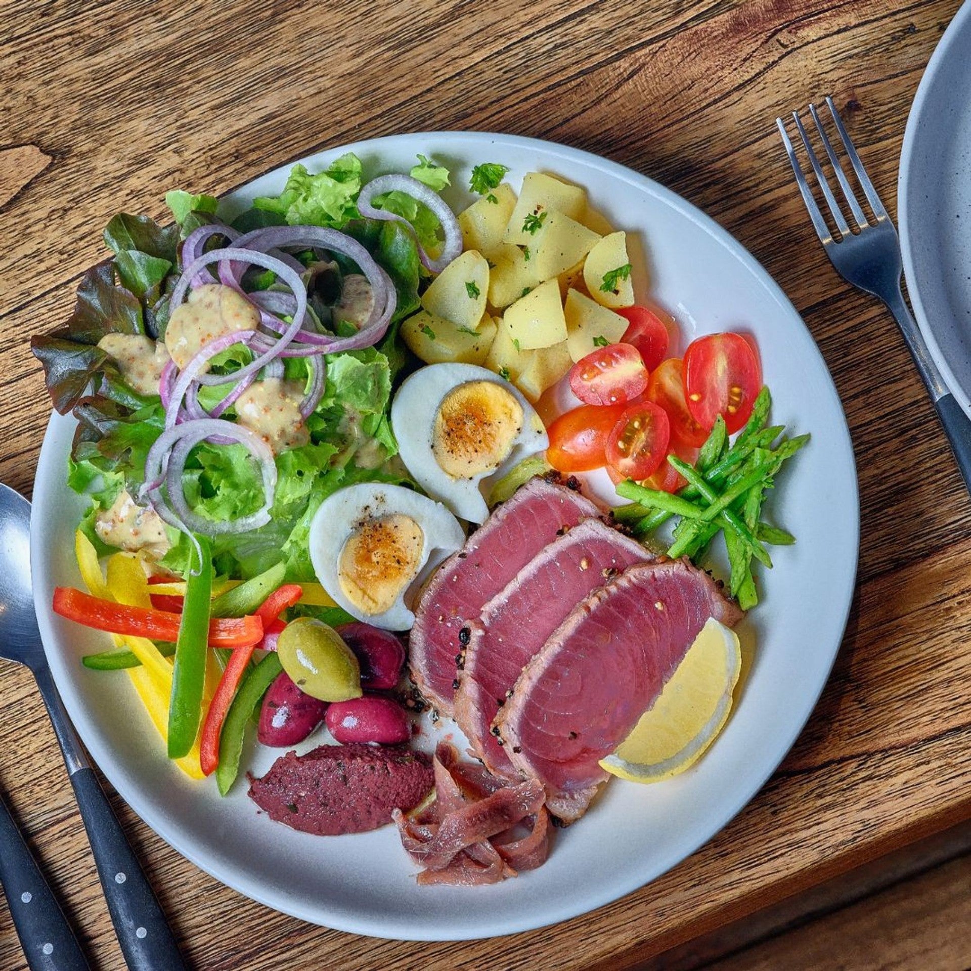 Savor the vibrant medley of flavors in our homemade Niçoise salad at Cagette. This culinary masterpiece features succulent peppered tuna, briny anchovies, and plump olives, artfully arranged with crisp bell peppers, tender potatoes, and a bed of fresh, organic greens. Each ingredient is thoughtfully selected to deliver a symphony of tastes, creating a perfect harmony of savory and refreshing notes. Experience a true taste of the Mediterranean, meticulously crafted with love and care. Indulge in a burst of flavor that celebrates the essence of fine, fresh, and organic ingredients.