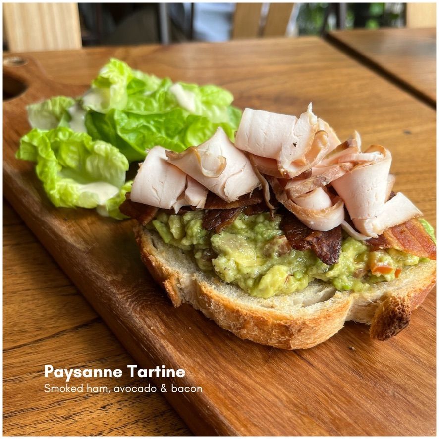 Discover the charming rusticness of our Paysane Tartine, a lovely creation that honors life's basic pleasures. This open-faced sandwich, which is made with thick sourdough bread, deftly mixes creamy avocado, smoky bacon, and delicious smoked ham. Each mouthful is a seamless fusion of flavors and textures that whisks you away to a warm farmhouse in the French countryside.