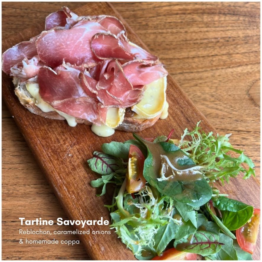 Our Savoyarde Tartine is a gastronomic tribute to the charming Savoie area, which is tucked away in the center of the French Alps. This mouthwatering open-faced sandwich has a melty layer of creamy Reblochon cheese, which is delicately complemented by the boldness of Coppa and the sweetness of caramelized onions. Each mouthful transports the eater through the quaint chalets and snow-covered peaks, encapsulating the very best of Alpine delight.